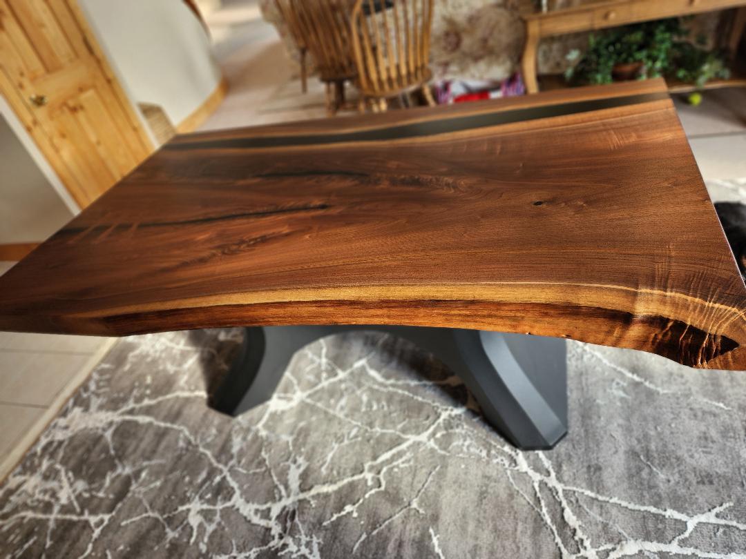 We got our solid walnut live edge dining/ kitchen table about a year and a half ago delivered to our home and set up for us. It is just beautiful! At first I didn’t even want to use it because I didn’t want anything to happen to it but then I soon realized that it was made to be used. It holds up under every day use very well. Is a heavy well-made piece of furniture,unlike any other furniture that we have in our home. It is the most prized piece of furniture that we have plus a matching bench completes it perfectly!